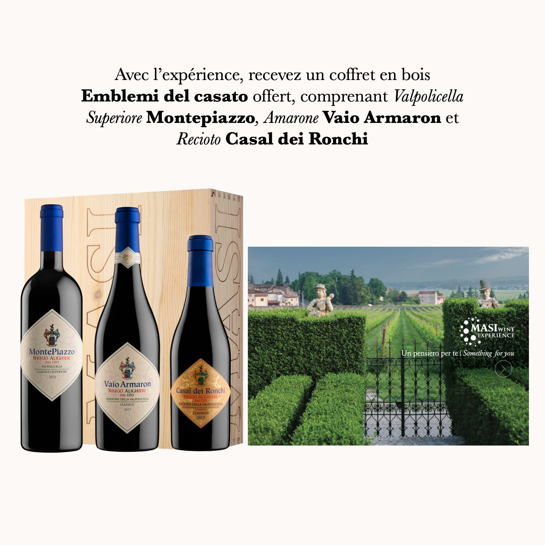 - 1 coffret en bois « Emblemi del Casato » contenant 3 bouteilles de :  MontePiazzo Valpolicella Superiore, Vaio Armaron Amarone Classico della Valpolicella, Casal dei Ronchi Recioto Classico DOCG ;