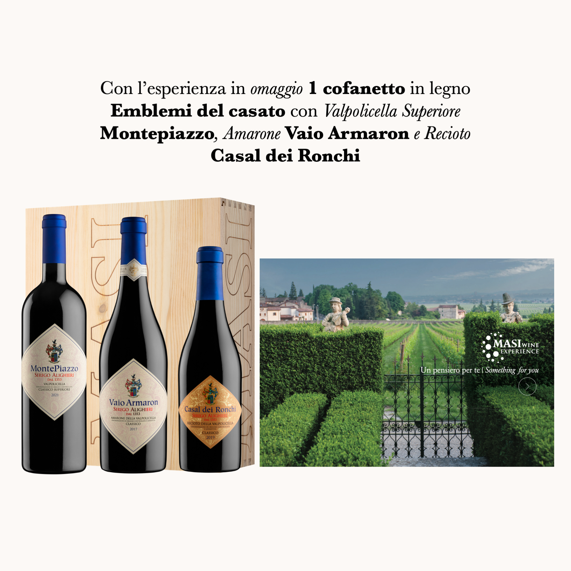 - 1  cofanetto in legno "Emblemi del Casato" con 3 bottiglie di:  MontePiazzo, Valpolicella Superiore, Vaio Armaron Amarone Classico della Valpolicella, Casal dei Ronchi, Recioto Classico DOCG