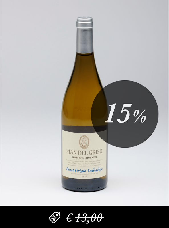 Pian del Griso, dieser Wein wird aus 100% Pinot Grigio Trauben hergestellt, die ausschließlich aus Trauben von besonders geeigneten Böden auf den historischen Besitzungen der Grafen Bossi Fedrigotti im Trentin angebaut werden.