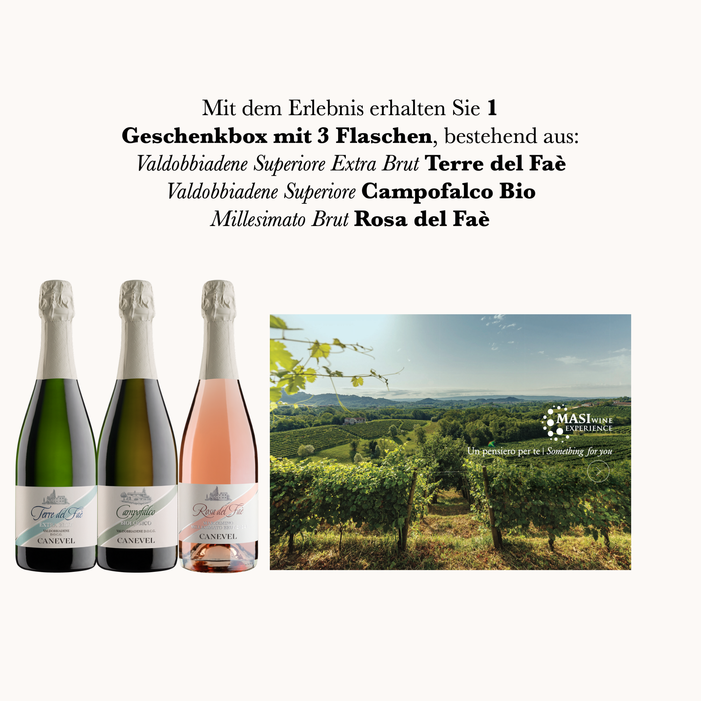 - 1 Packung mit 3 Flaschen von: Valdobbiadene Superiore Extra Brut Terre del Faè, Valdobbiadene Superiore Campofalco bio, Brut Rosa del Faè