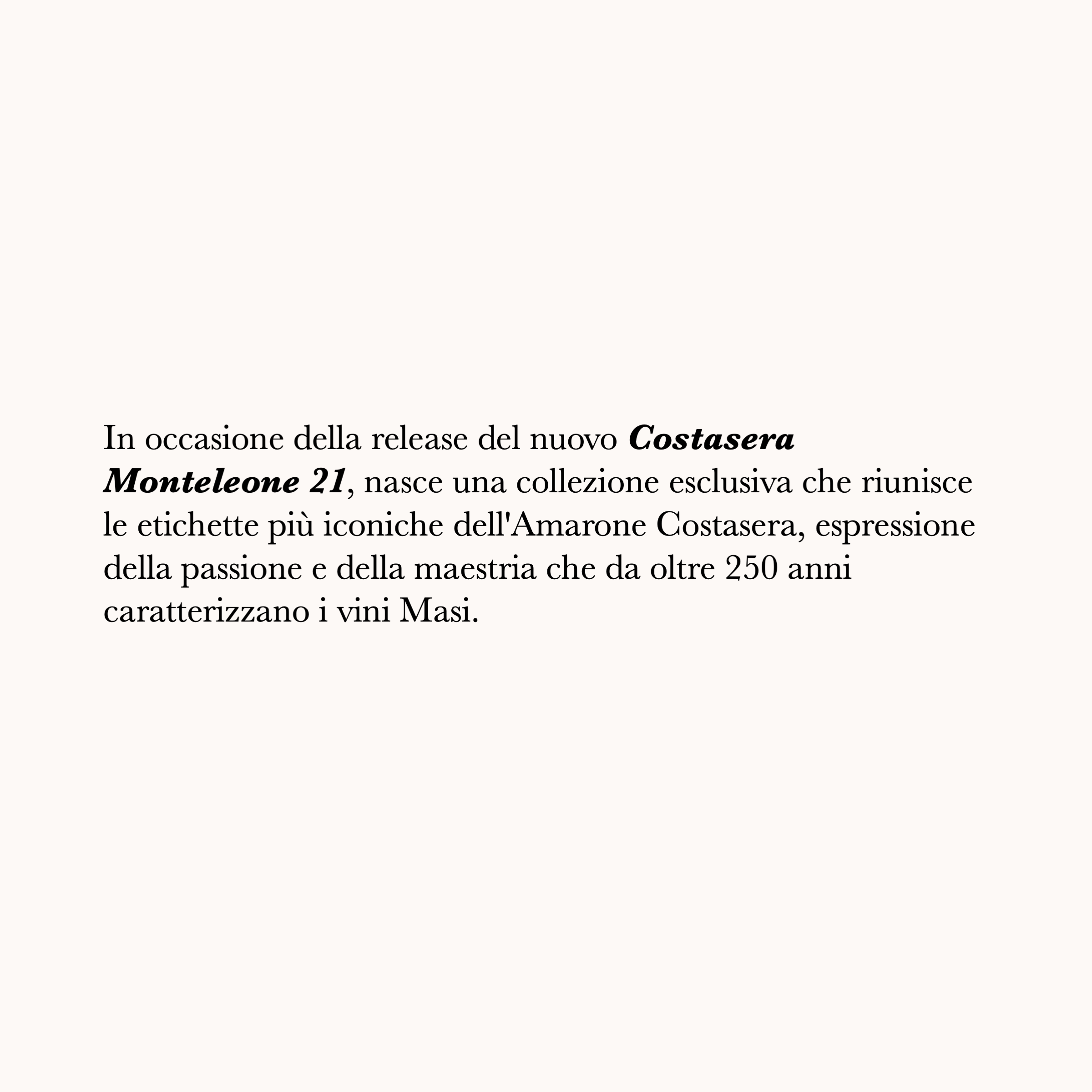 In occasione della release del nuovo Costasera Monteleone 21, nasce una collezione esclusiva che riunisce le etichette più iconiche dell'Amarone Costasera, espressione della passione e della maestria che da oltre 250 anni caratterizzano i vini Masi.