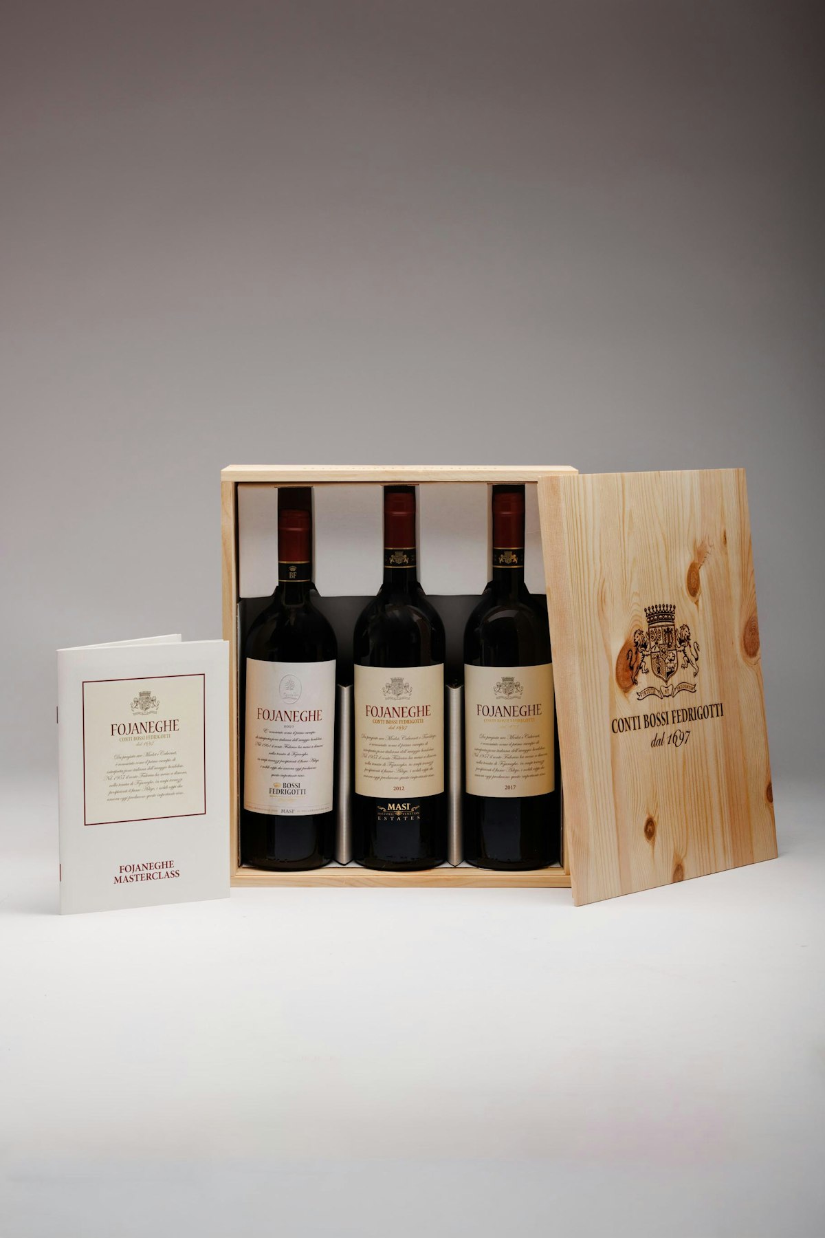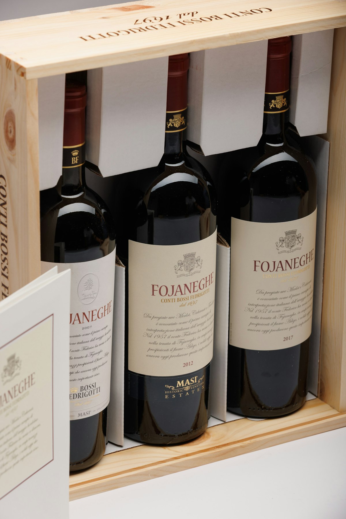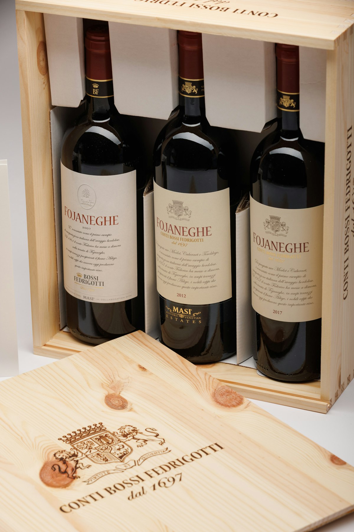 La selezione propone tre annate iconiche di Fojaneghe Rosso Vigneti delle Dolomiti IGT – 2007, 2012 e 2017 – custodite in elegante confezione, per offrire un viaggio sensoriale tra epoche e stili diversi, espressione del terroir trentino e della tradizione enologica di montagna. Una collezione da intenditori, perfetta per degustare, collezionare o regalare.