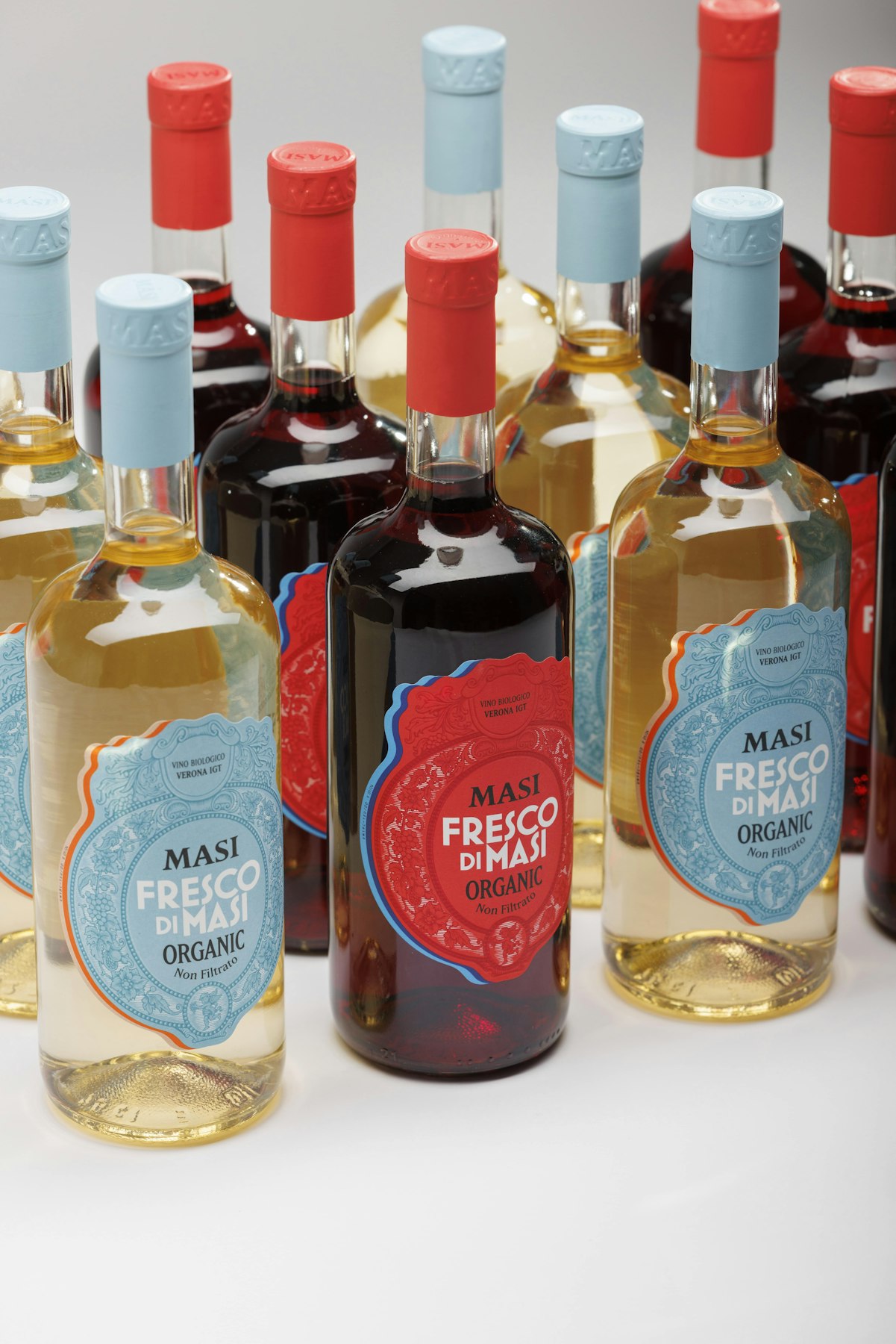 La nuova “Bottiglia Masi” della linea Fresco di Masi, sottile e robusta al tempo stesso, dal design che unisce l’estetica alla leggerezza, è stata ideata per accogliere la gamma di vini biologici di Masi, prodotti per sottrazione e con il minimo intervento dell’uomo sulla natura. Questi vini sono ottenuti da uve raccolte nelle ore più fresche ed immediatamente vinificate. Il Fresco di Masi Rosso sprigiona una spiccata fragranza di frutta fresca con l’immancabile nota di ciliegia, tipica dei rossi veronesi. Il Fresco di Masi Bianco, conserva piacevoli note agrumate e delicati profumi di campo.