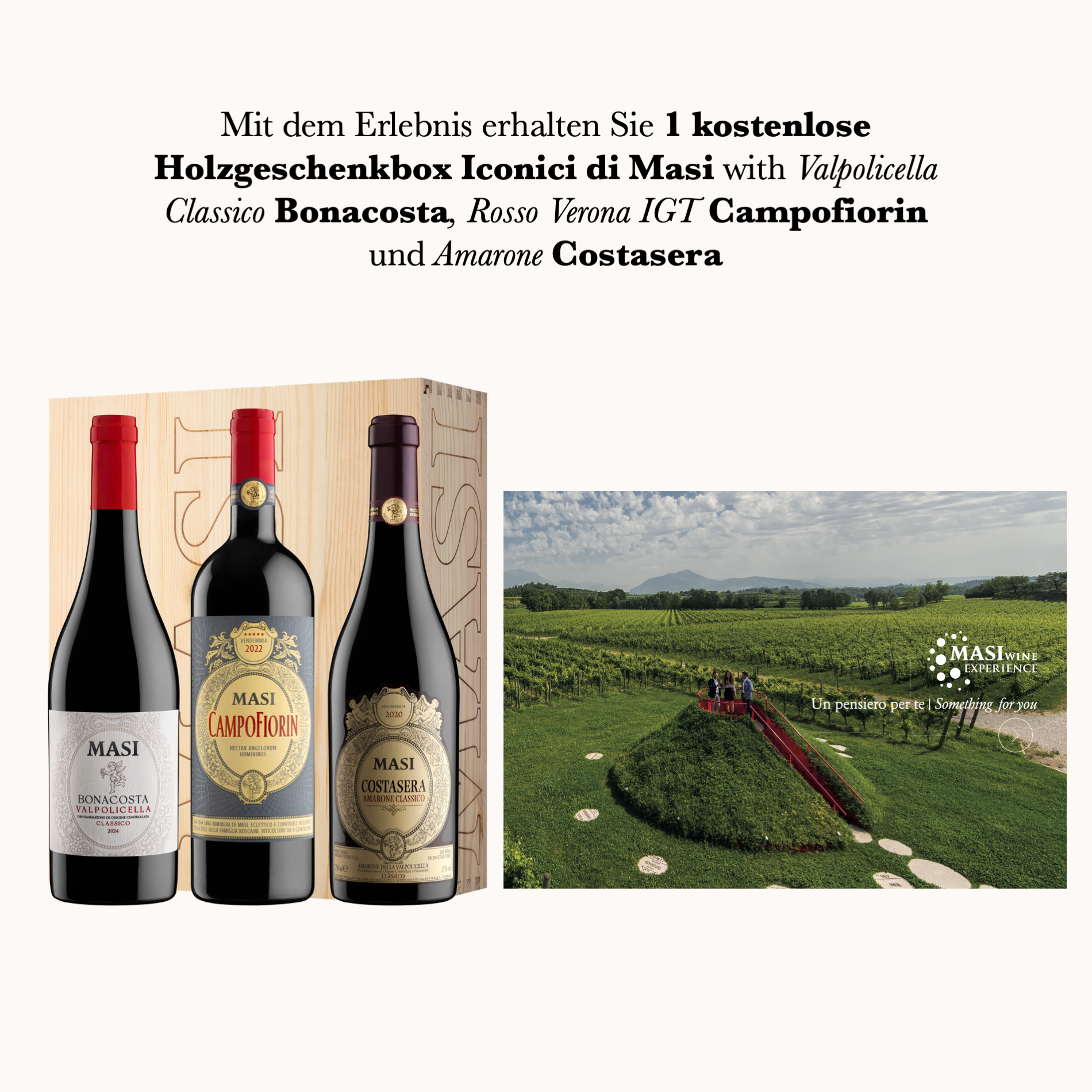 - 1 Holzpackung "Ikonische Weine von Masi" mit 3 Flaschen von: Valpolicella Bonacosta, Rosso Verona Campofiorin, Amarone Costasera