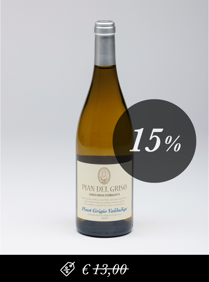 Pian del Griso, this 100% Pinot Grigio wine is produced on the historic Conti Bossi Fedrigotti estates from grapes picked in their ideally-sited vineyards in Trentino. Known locally as Ruländer here for centuries, this Pinot Grigio gives the maximum in terms of aromatic qualities and has perfect balance thanks to the ideal pedoclimatic conditions of the vineyards, which bring out the wine’s typical freshness and minerality.